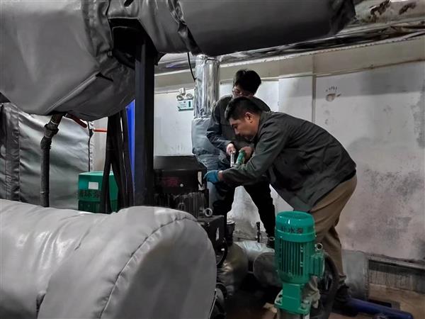 熱力公司工作人員為園丁南區(qū)換熱站內(nèi)循環(huán)泵加黃油